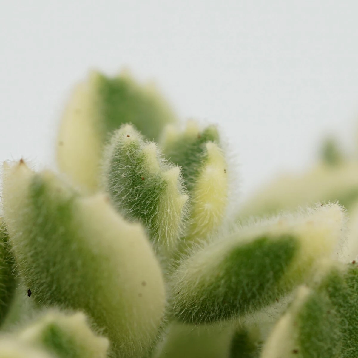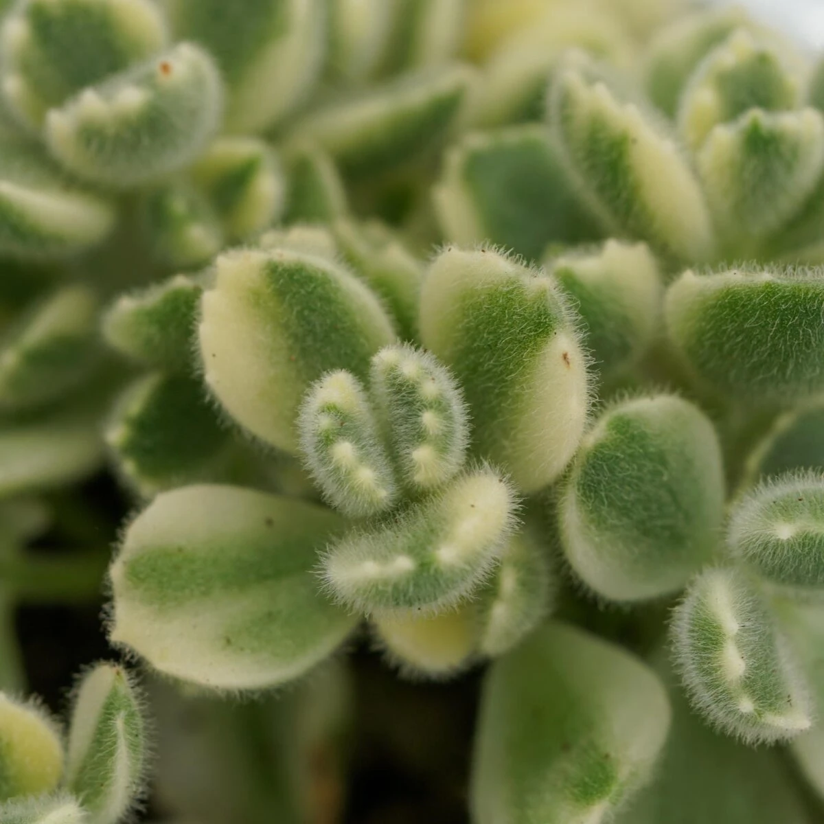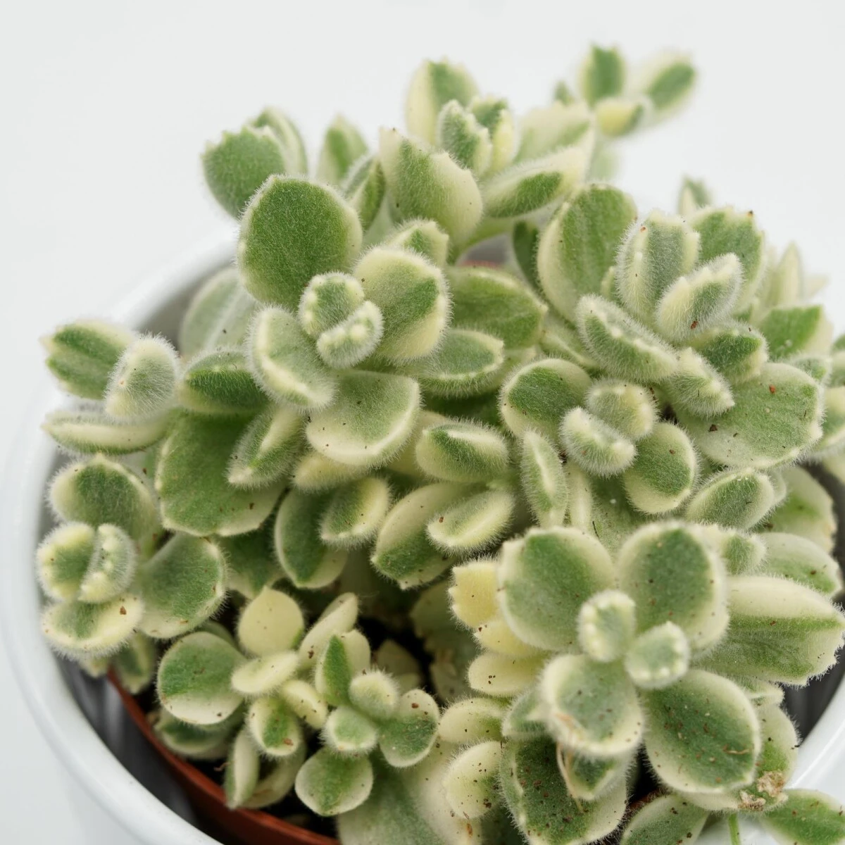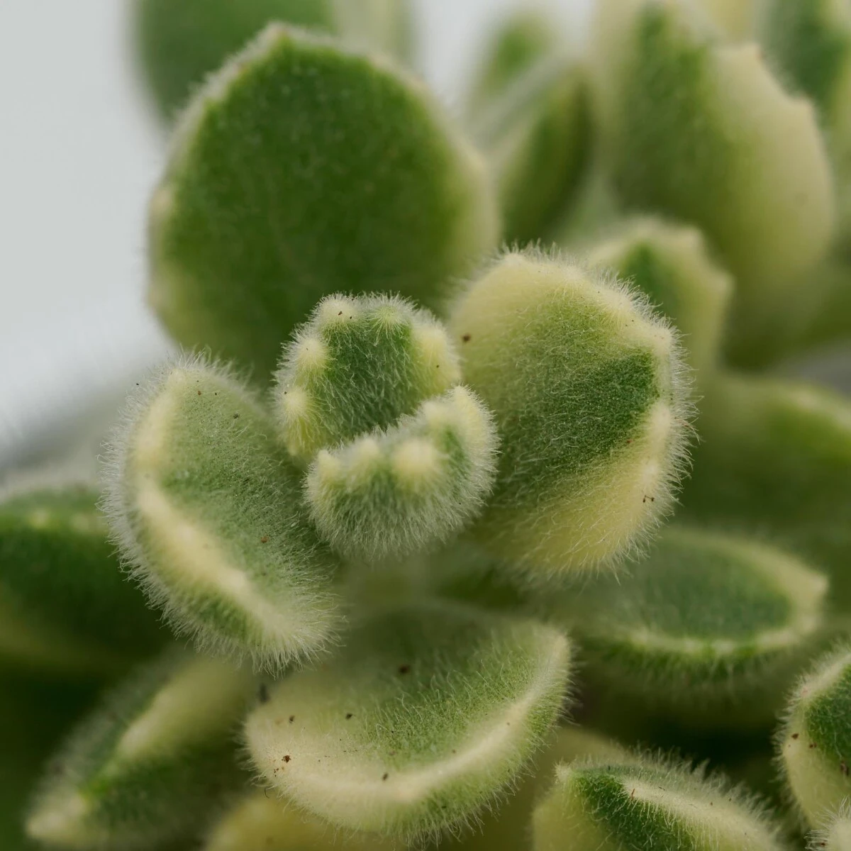 Cotyledon tomentosa ‘Variegata’ ist grün, gelb und weiß mit einer kompakten, verzweigten Wuchsform. Die Blüte ist orangerot bis gelb, fünfblättrig und an einem verzweigten Blütenstiel angeordnet. Sie bildet sich innerhalb der Blütezeit von Sommer bis Herbst. Du erhältst eine Pflanze der Topfgröße 8,5cm, mit Gesamthöhe von Topf und Pflanze von etwa 12cm. Die erreichbare Wuchshöhe liegt bei 10cm bis 15cm.