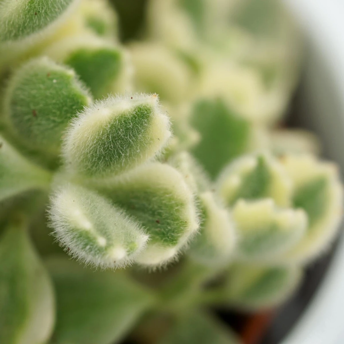 Die Pflege der Cotyledon tomentosa ‘Variegata’ ist relativ einfach. Als Substrat bietet sich eine Mischung aus Kakteen- und Sukkulentenerde an. Staunässe verträgt die Cotyledon tomentosa ‘Variegata’ nicht, daher sollte man auf einen guten Ablauf des Wassers achten und das Substrat vor erneutem Gießen antrocknen lassen. Generell verträgt diese Sukkulente eher zu wenig als zu viel Wasser. Düngen kann man einmal im Monat also alle vier Wochen. Der Lichtbedarf dieser Sukkulente ist an einem sonnigen Standort erfüllt. Das heißt, ein Südfenster mit direkter Sonneneinstrahlung ist am besten geeignet. Die optimale Temperatur liegt zwischen 20°C und 30°C. Den Sommer kann Cotyledon tomentosa ‘Variegata’ im Freien verbringen, nachdem man sie schrittweise an die direkte Sonne gewöhnt hat. Im Winter sollte die Temperatur bei circa 10°C liegen. Außerdem wird nicht mehr gedüngt und das Gießen reduziert. Für den Garten ist diese Sukkulente jedoch nicht geeignet.