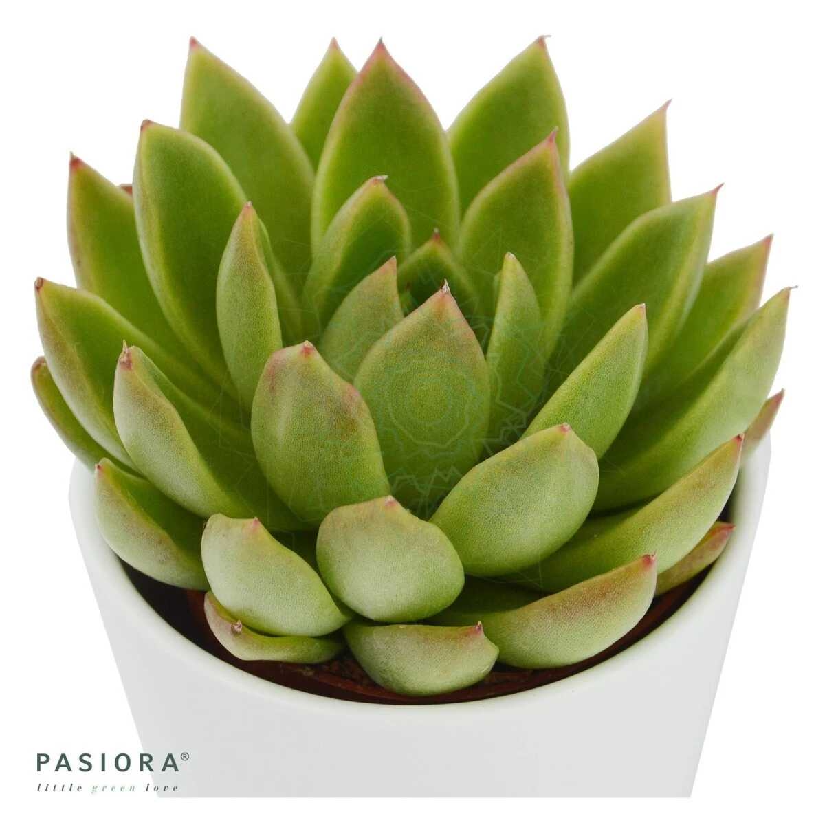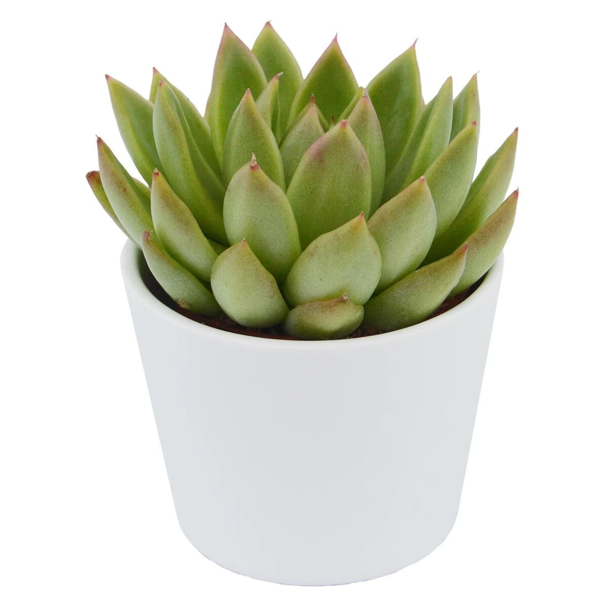Beheimatet ist diese Sukkulente in Mexiko. Echeveria agavoides ist grün und rot mit einer rosettenförmigen Wuchsform. Die Blüte ist pink mit gelben Spitzen, röhrenförmig und in Zymen angeordnet. Sie bildet sich innerhalb der Blütezeit von Januar bis Juni. Du erhältst eine Pflanze der Topfgröße 6cm, mit Gesamthöhe von Topf und Pflanze von etwa 8cm. Die erreichbare Wuchshöhe liegt bei 15cm bis 30cm.