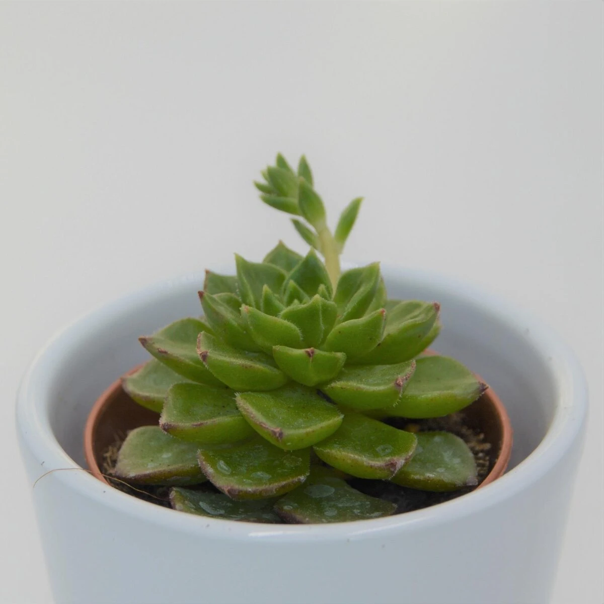 Sedveria ‘Letizia’ ist grün und rot mit einer rosettenförmigen Wuchsform. Die Blüte ist weiß, glockenförmig und nah an der Rosette. Sie bildet sich innerhalb der Blütezeit von Herbst bis Frühjahr. Du erhältst eine Pflanze der Topfgröße 5,5cm, mit Gesamthöhe von Topf und Pflanze von etwa 8cm. Die erreichbare Wuchshöhe liegt bei 10cm bis 20cm.